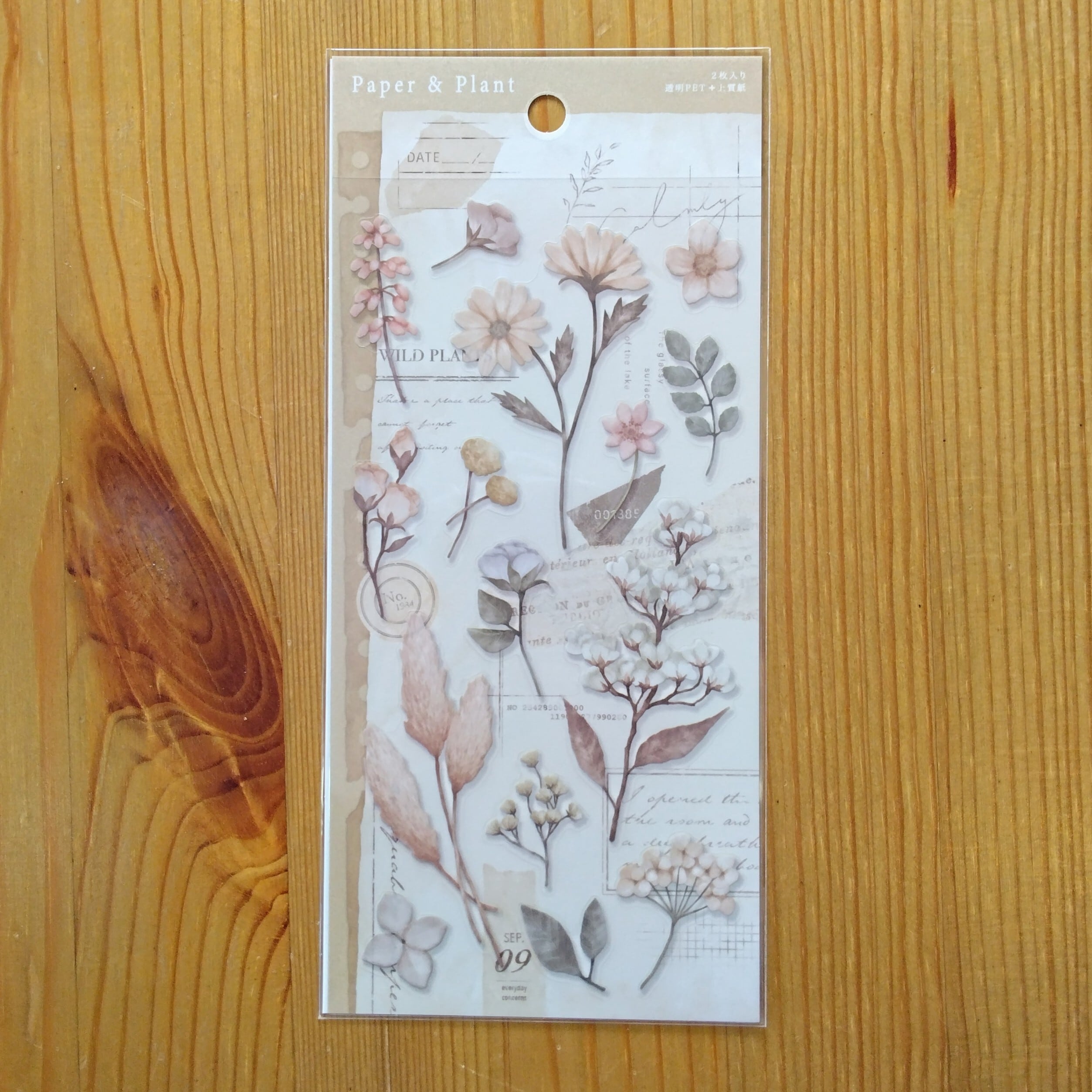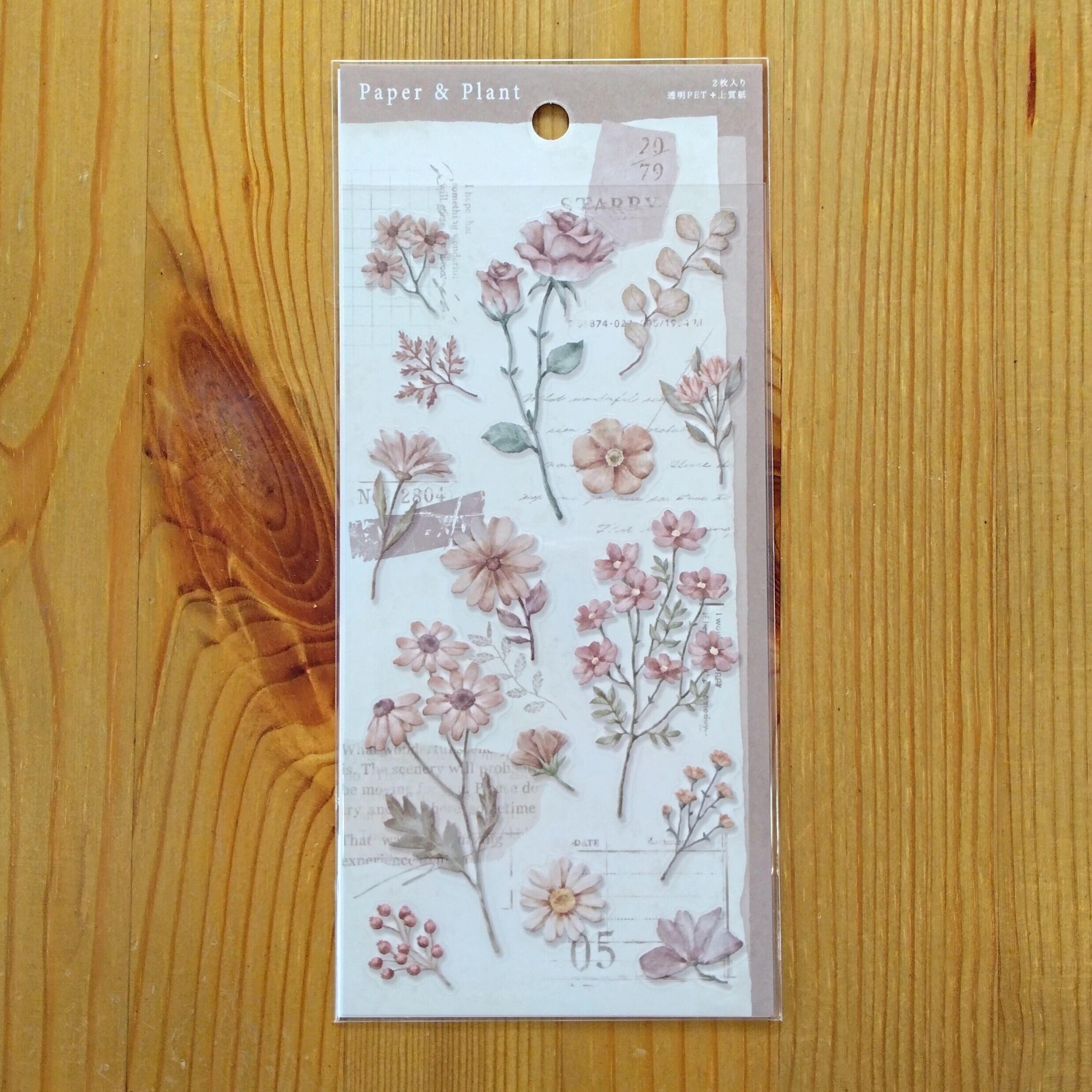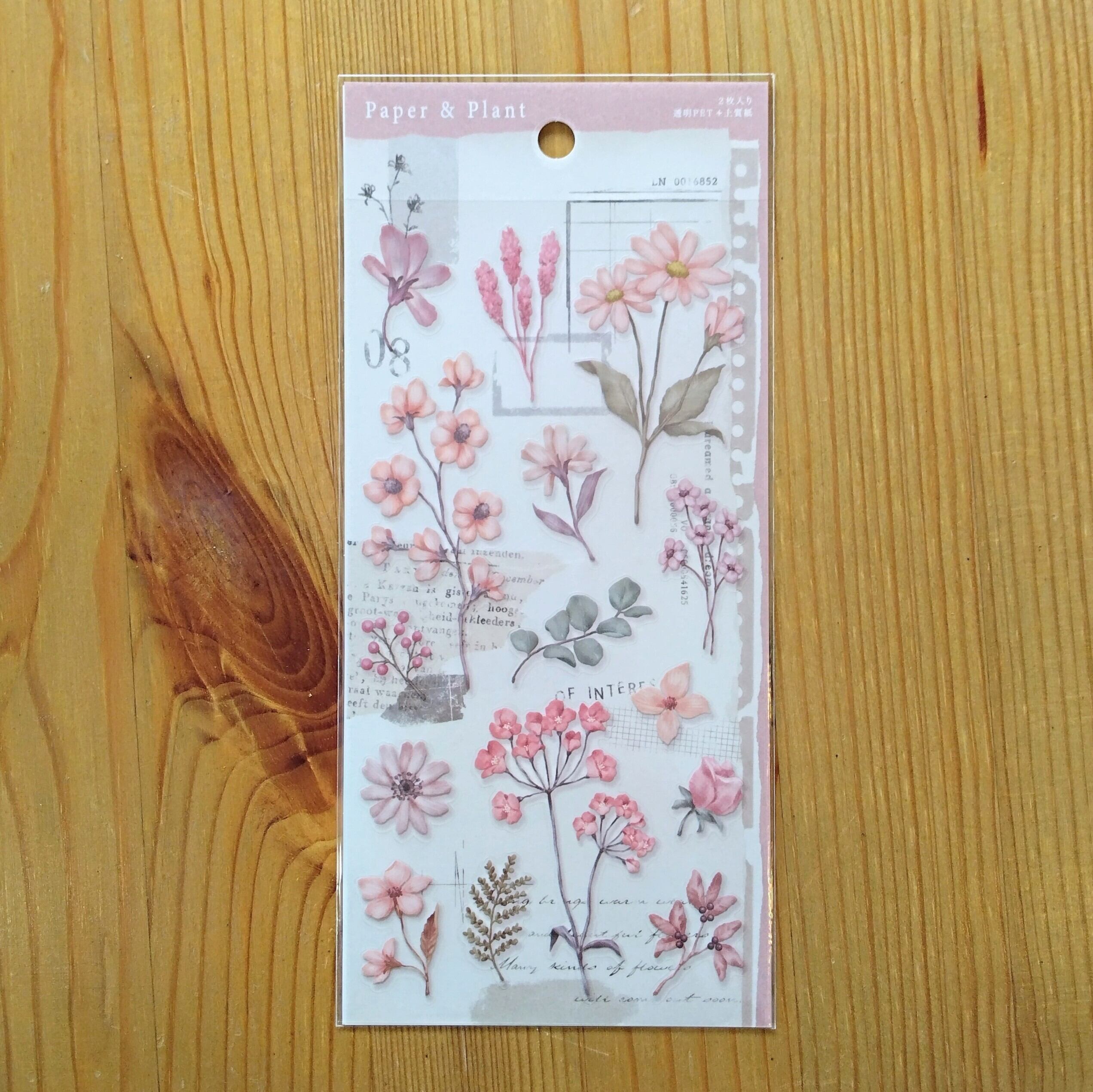 ハサミで切ったり手でちぎったりできる上質紙のベースに使用出来そうなペーパーデザインと透明PET素材の植物イラストデザイン、2種類の素材のシール入りです。